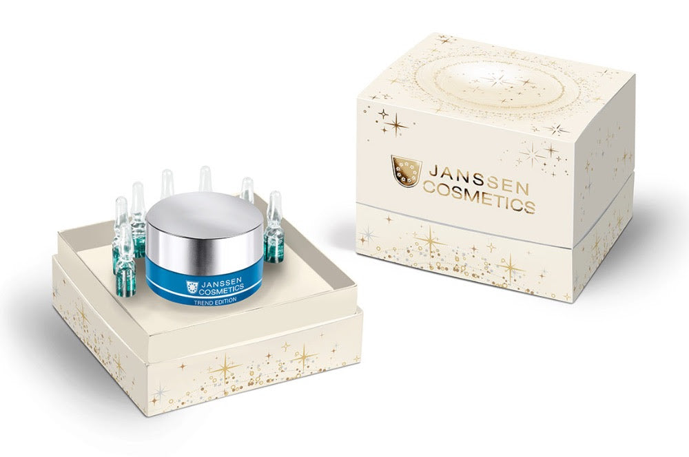 Janssen Cosmetics kollageenituotteet on pakattu joulun 2025 kunniaksi tyylikkääseen lahjapakkaukseen; tämän kiinteyttävän ja kosteuttavan tehoduon hoitovaikutus perustuu merikollageeniin, hyaluronihappoon ja granaattiomenauutteeseen. Yhdessä käytettynä Marine Collagen Fluid -ampullien ja Marine Collagen Cream -voiteen hoitovaikutus on optimaalisen tehokas; lopputuloksena on näkyvästi sileämpi, kiinteämpi ja hehkuvampi iho.