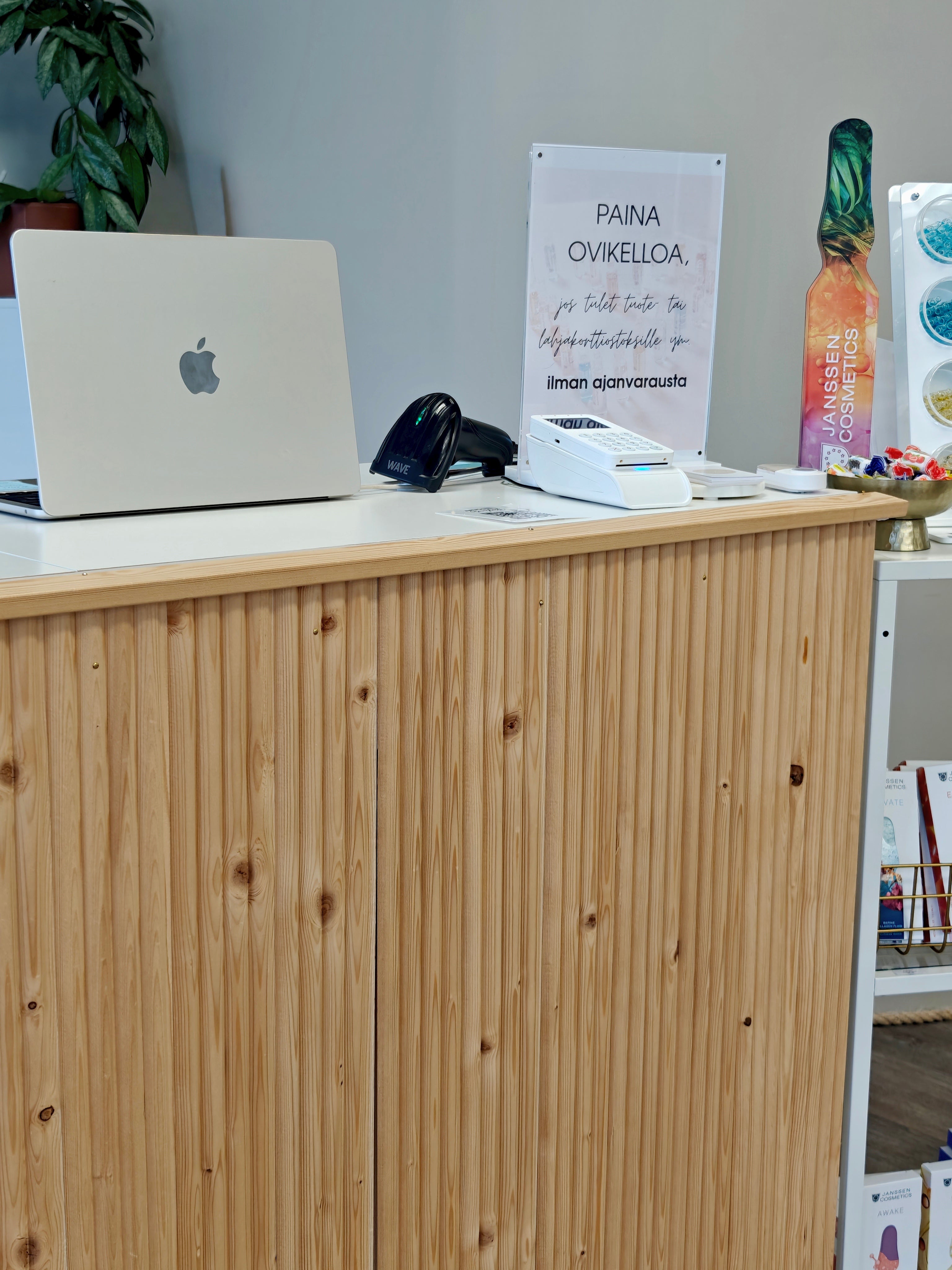 Taustalla soi rentouttava musiikki. Emme vastaa puheluihin asiakkaiden aikana.
